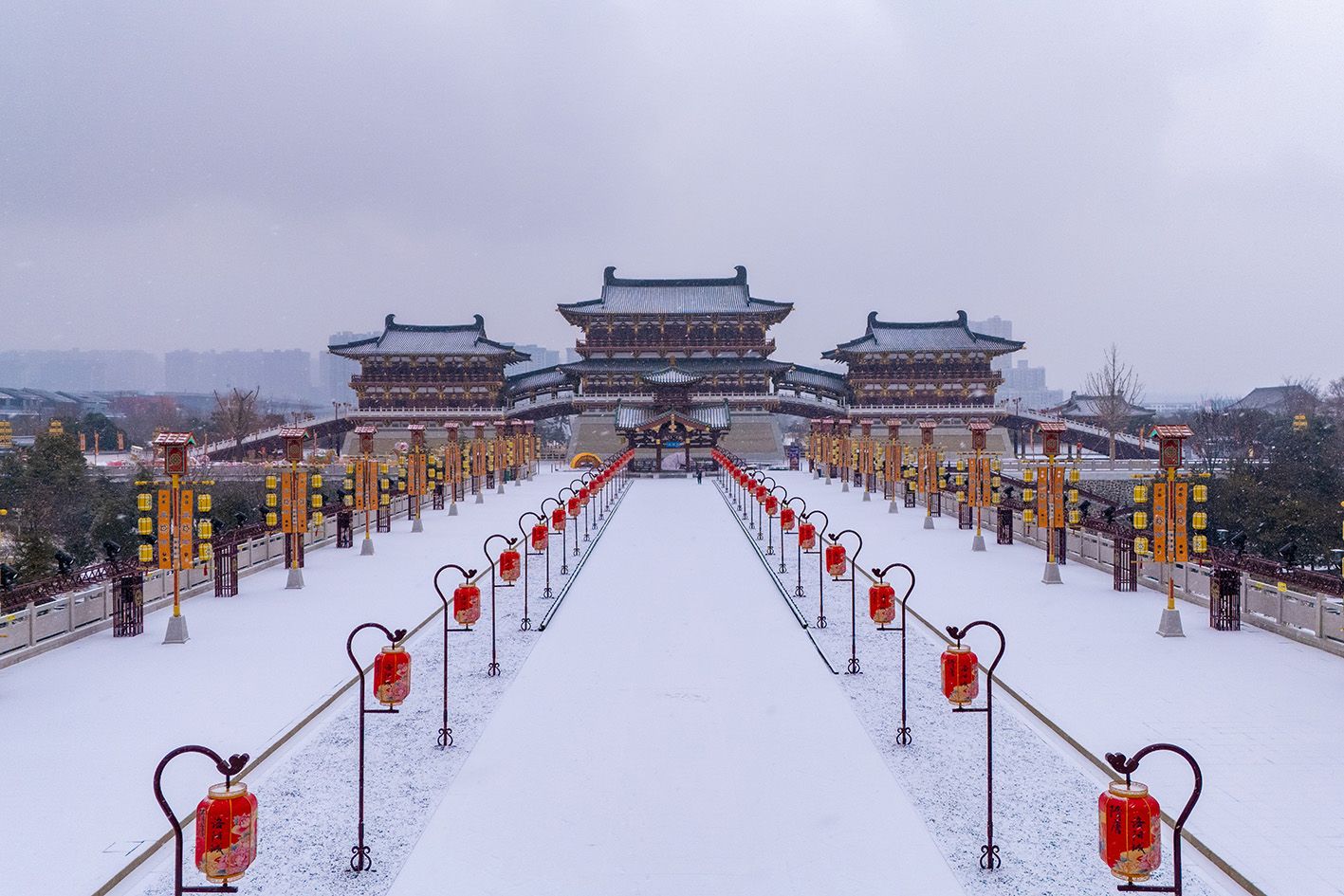 1月19日,古都河南洛阳迎来降雪天气,隋唐洛阳城应天门、明堂天堂、九洲池等景区银装素裹。图为雪后九洲池景区。(中新社)