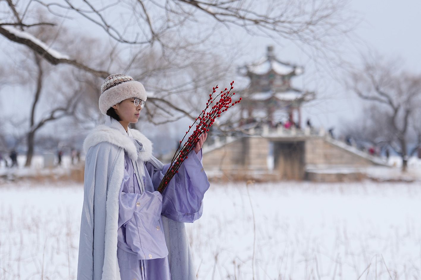 1月18日,雪后的北京颐和园风景如画,吸引民众游览。图为一名游客身穿古装拍照。(中新社)