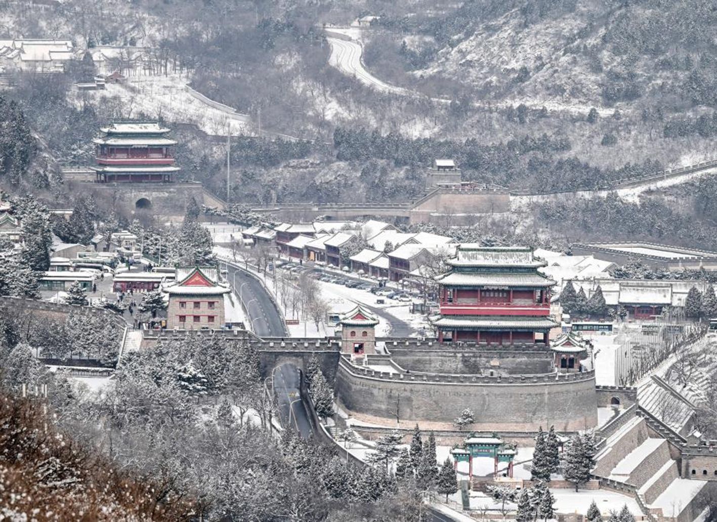 这是1月18日拍摄的居庸关长城南关城楼(前)和北关城楼雪景。1月17日至18日晨,北京迎来降雪。雪霁天晴,居庸关长城内外银装素裹,尽显雄关壮美。(新华社)
