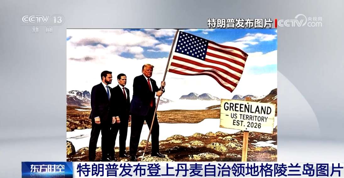 美国总统特朗普当地时间20日凌晨在社交媒体上发布图片,他手拿美国国旗登上格陵兰岛,身后站着美国副总统万斯和国务卿鲁比奥,旁边指示牌上写着“格陵兰岛2026年成为美国领土”。