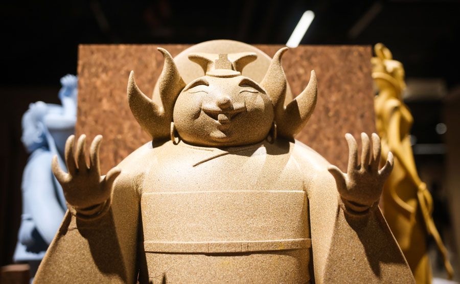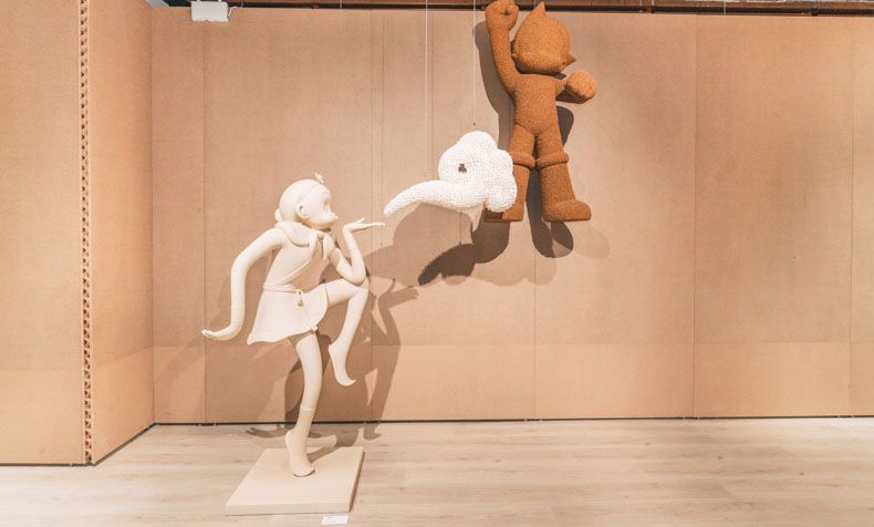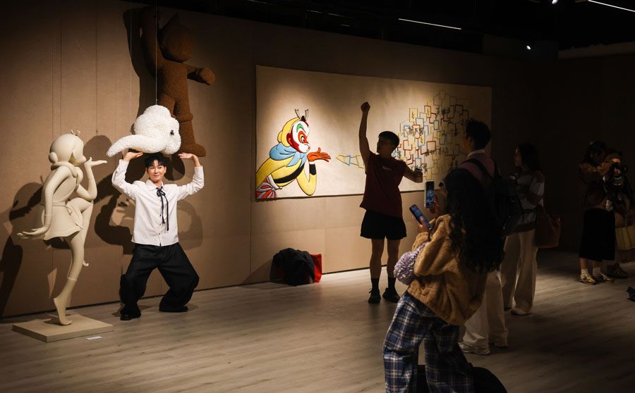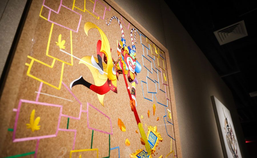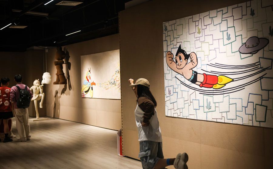 当东方神话中的“齐天大圣”与日本漫画里的“科学之子”在上海外滩相遇,一场跨越国界与时空的文化对话就此展开。近日,一场名为“用十万马力去七十二变”的跨界艺术展在BFC外滩金融中心揭幕,将中国《大闹天宫》中的孙悟空与手冢治虫创作的阿童木并置。这不仅是一次潮流艺术的碰撞,更是续写了自1981年两位角色创作者——万籁鸣、严定宪与手冢治虫历史性握手以来,绵延四十余年的动画情缘。展览以《大闹天宫》、《金猴降妖》和《铁臂阿童木》等经典动画为灵感,通过艺术家黄小眠的当代艺术创作,重构孙悟空与阿童木两大IP的视觉表达与文化内涵。通过全球最大的孙悟空软木雕塑等可持续艺术作品,让经典IP在当代语境下焕发新生,探讨文化传承与科技未来的共生主题。图为展览现场。(上海上观新闻网)