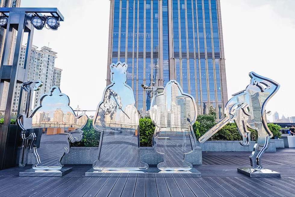 此外,展览还延伸到户外露台展区,科技艺术的呈现维度得到进一步拓展:“浮光掠影”雕塑装置以金属框架和智能灯带为核心材质,通过灯光明暗变化与唐僧师徒四人的剪影,共同营造出动态的光影艺术效果;同步配备机器人装置,打造城市中的潮流新地标。(上海黄浦微信公众号)