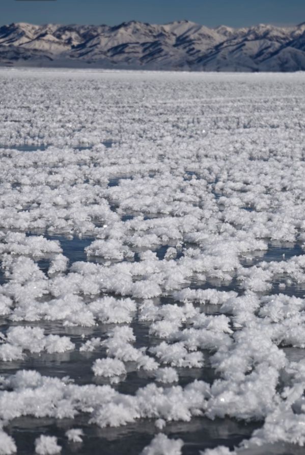 据博州零距离微信公众号介绍,“冰推”的形成,源于昼夜温差大、夜间气温极低。届时,赛里木湖湖面会凝结出一层晶莹剔透的薄冰,在风力推动下,尚未冻实的薄冰碎裂成片,不断涌向岸边堆叠;“冰花”则是在气温骤降时,水汽依附冰面尘埃凝结成精致冰晶的结果。