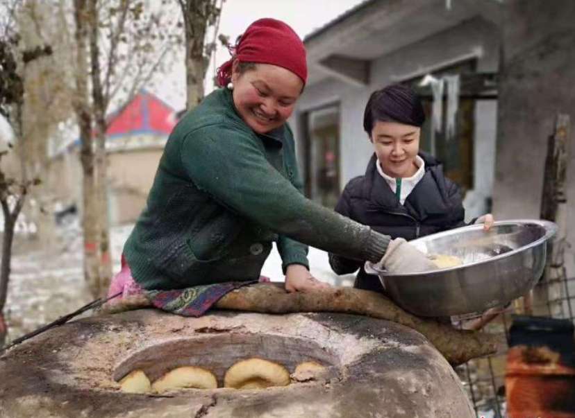 贺娇龙(右)生前帮助村民帕纳尔古丽·阿里木拉提打馕。(图/中新网)