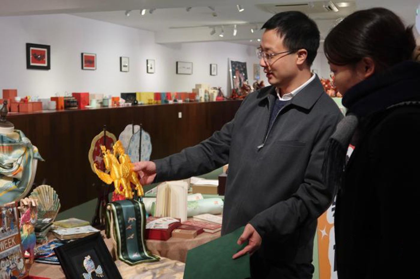 1月21日,工作人员(左)向游客介绍根据唐代翼马纹样设计的文创产品。(中新网)
