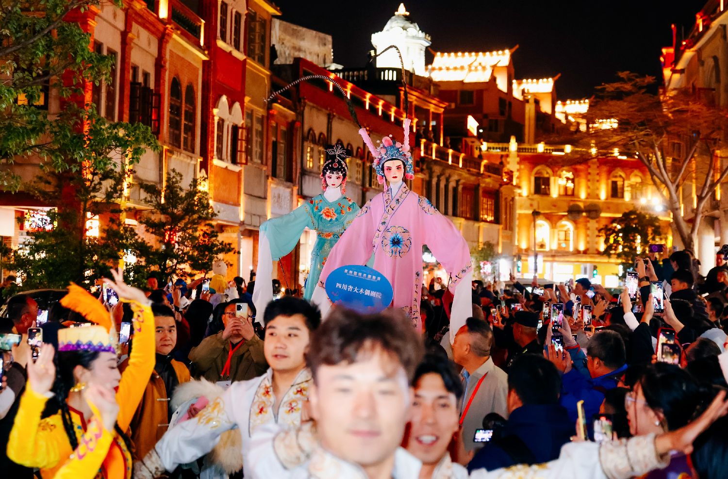 当地时间2025年12月14日晚,福建泉州古街区,参与泉州国际木偶展演的中外木偶表演团队在此巡游,与市民、游客互动。图为木偶巡游吸引大批民众围观。(图/中新社)