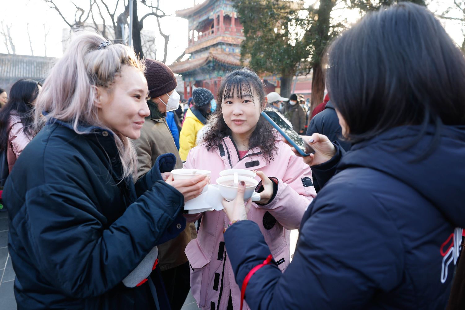 2026年1月26日,年轻的游客在雍和宫内品尝腊八粥。(王亚霓 摄)