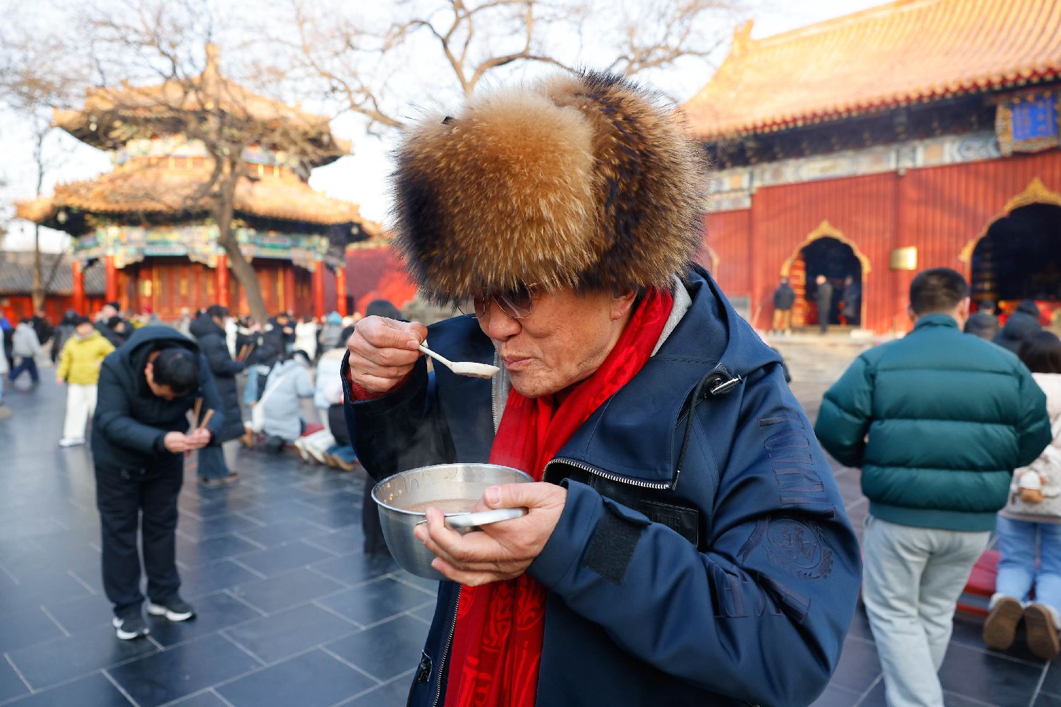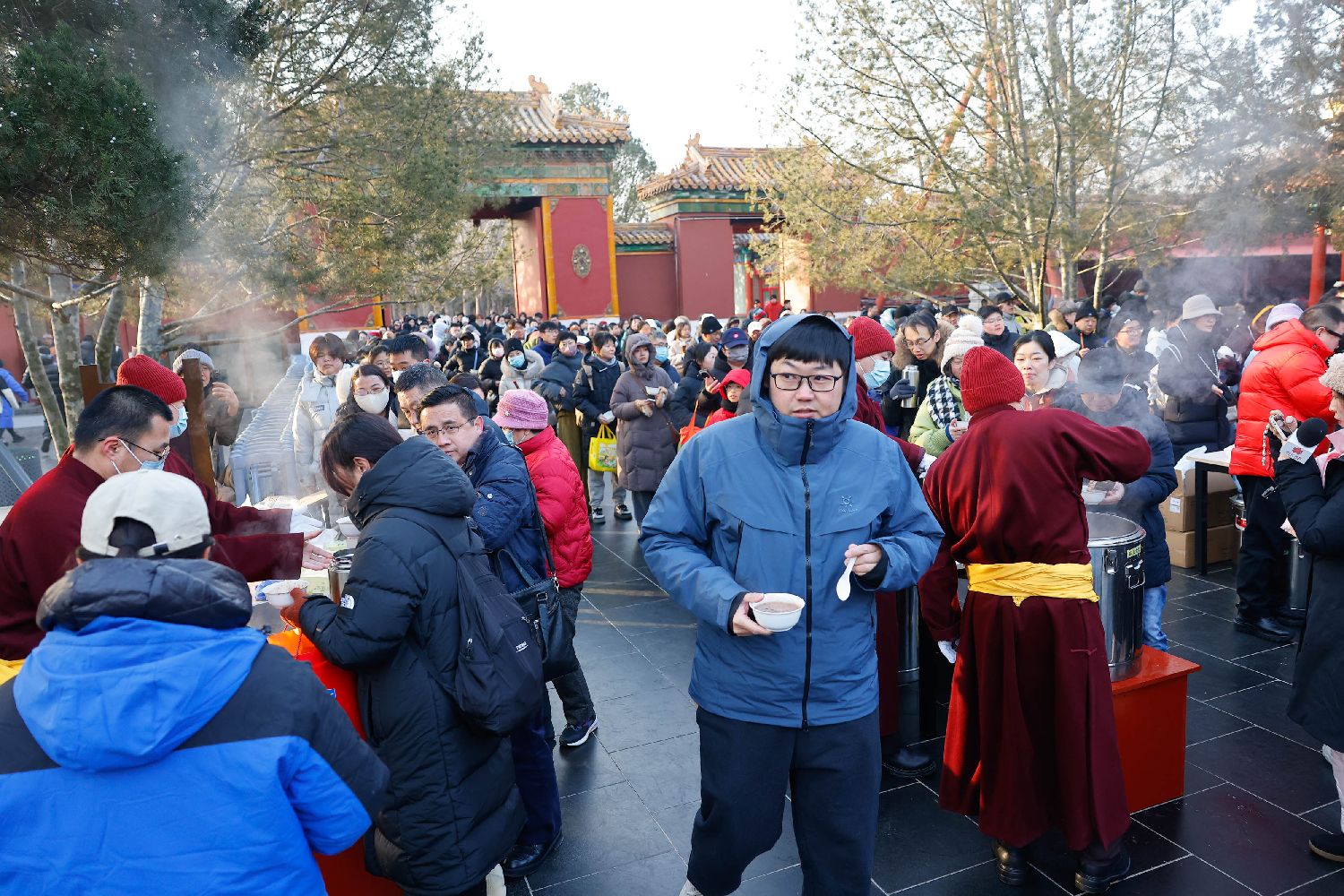 2026年1月26日,游客在雍和宫内品尝腊八粥。(王亚霓 摄)