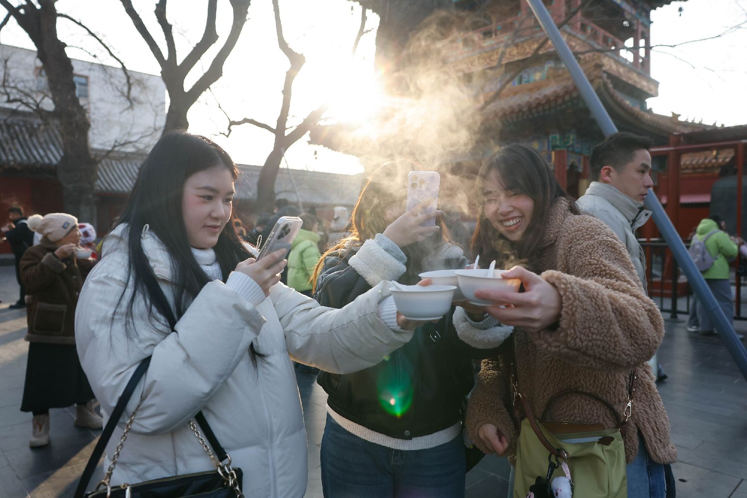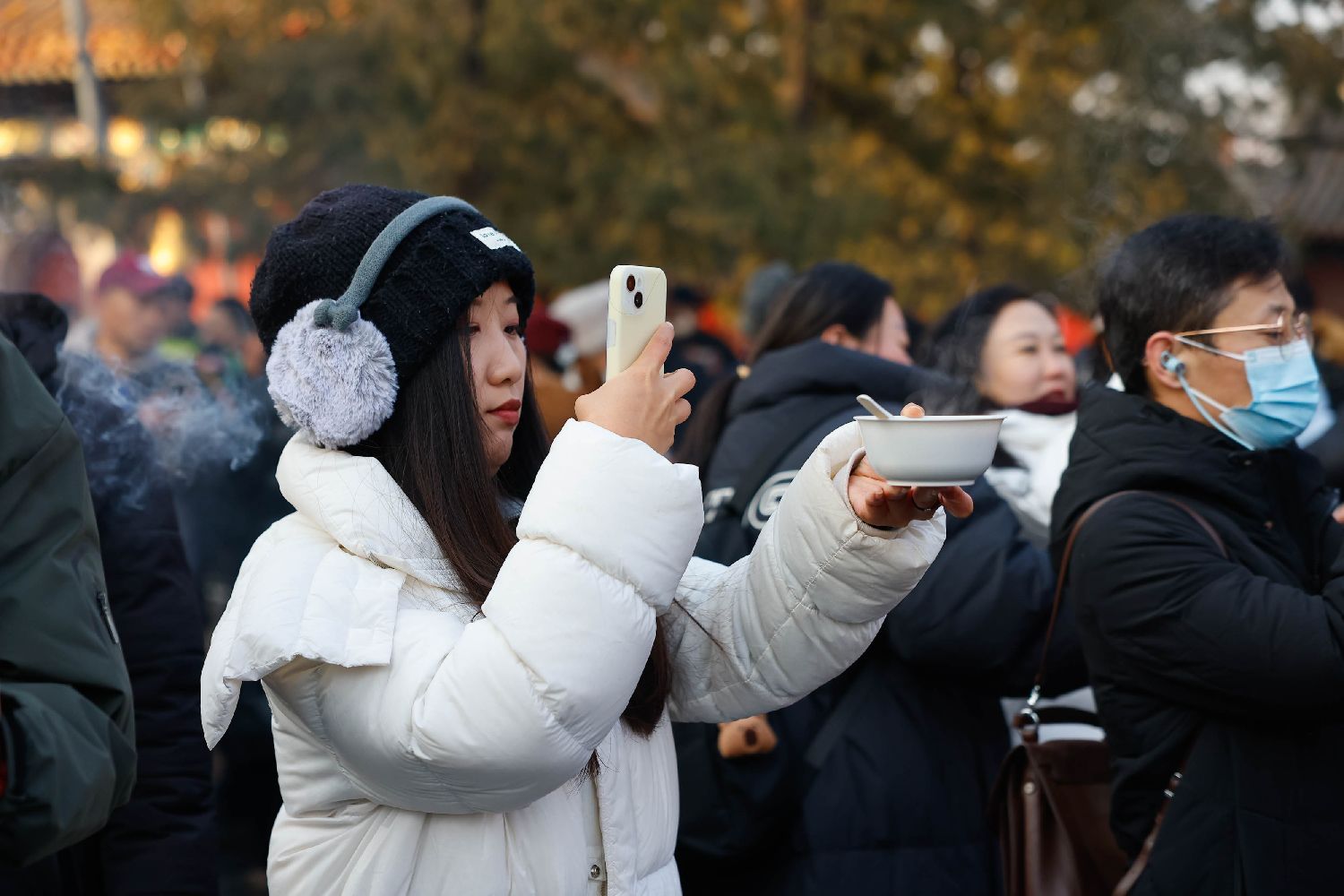 2026年1月26日,年轻的游客在雍和宫内品尝腊八粥。当日正值中国传统节日——腊八节,有喝腊八粥的习俗。北京雍和宫在这一天施粥,为游客送上冬日里最温暖的祝福。(王亚霓 摄)