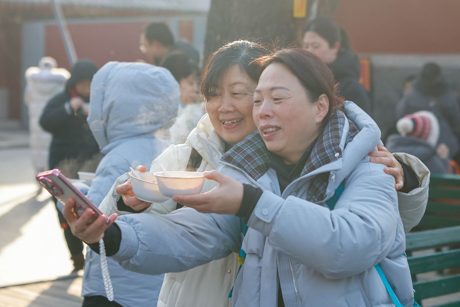 2026年1月26日,两名游客端着腊八粥合影。(王亚霓 摄)