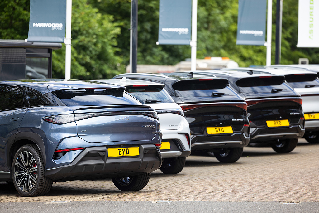 英国科尔斯登,中国比亚迪公司展厅外停放着汽车。(视觉中国)