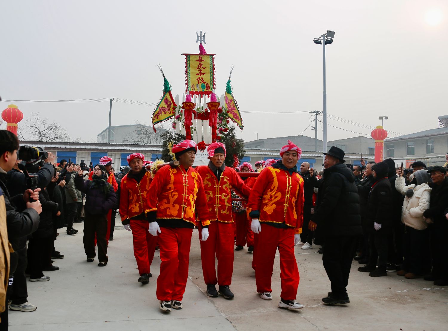 当地时间当日凌晨,村民们将预先制作的“冰山”翻转至冰尖朝上,并装饰以红色对联、彩色旗帜与纸花,摆放五谷供品。上午10时,随着号令响起,八名壮汉肩扛抬杠,在激昂的鼓乐声中,缓缓抬起“冰山”开始沿村巡游。队伍后方,铁棍、背棍、高跷、旱船、大头娃娃等传统社火表演纷纷亮相,配合着震天的锣鼓、欢腾的秧歌与舞狮,将村庄街巷变为一幅流动的民俗画卷。