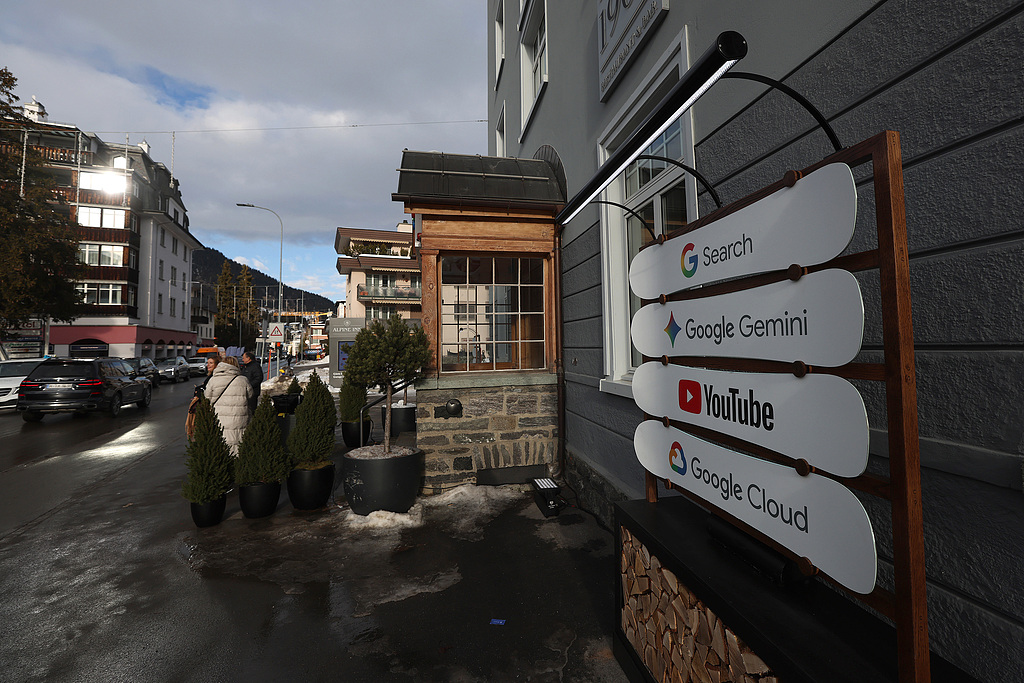 2026年达沃斯论坛谷歌展馆外的产品标识牌。(视觉中国)