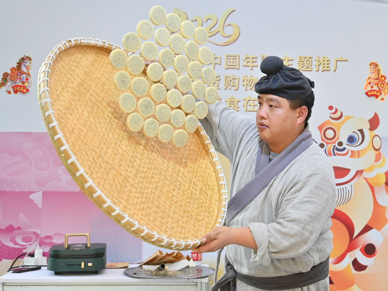 中国农历新年将至,天南地北年味浓,各地特色美食、非遗美味轮番登场,花式解锁舌尖上的中国年,鲜香诱人的年味满溢新春。图为1月26日,广东广州,2026非遗年货购物月主场活动暨“寻味中国年美食广东行”活动在广州天河区花城广场举办,工作人员展示浙江邵永丰麻饼制作技艺。(中新社)