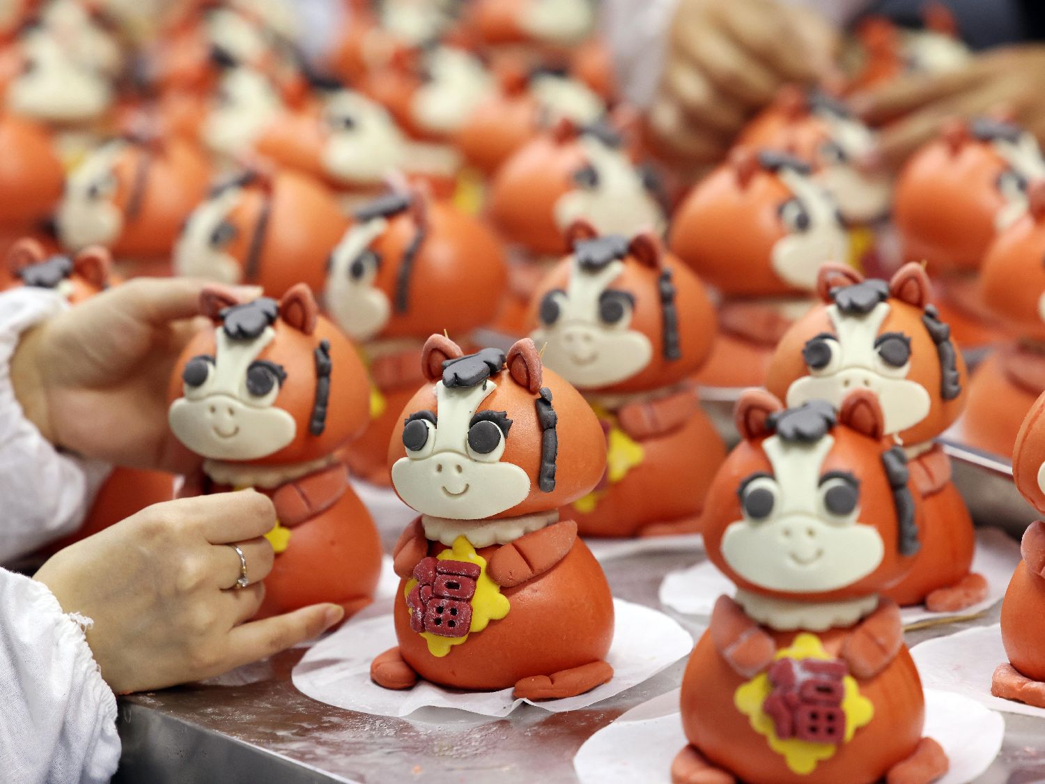 图为1月27日,江苏连云港,一家“花饽饽”工作坊的员工在制作生肖卡通“福马”花馍,他们用多种果蔬调色和面,设计蒸制出寓意吉祥的花馍,传递浓浓的年味。(中新社)