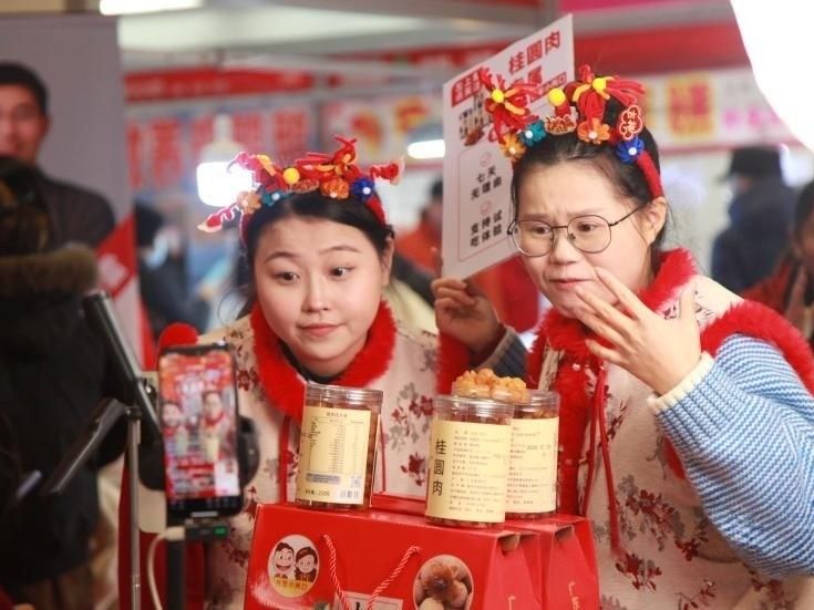 图为1月27日,江苏南京,2026第二十五届南京(全国)春节食品商品交易会在南京国际展览中心举办,工作人员在直播卖货。(中新社)