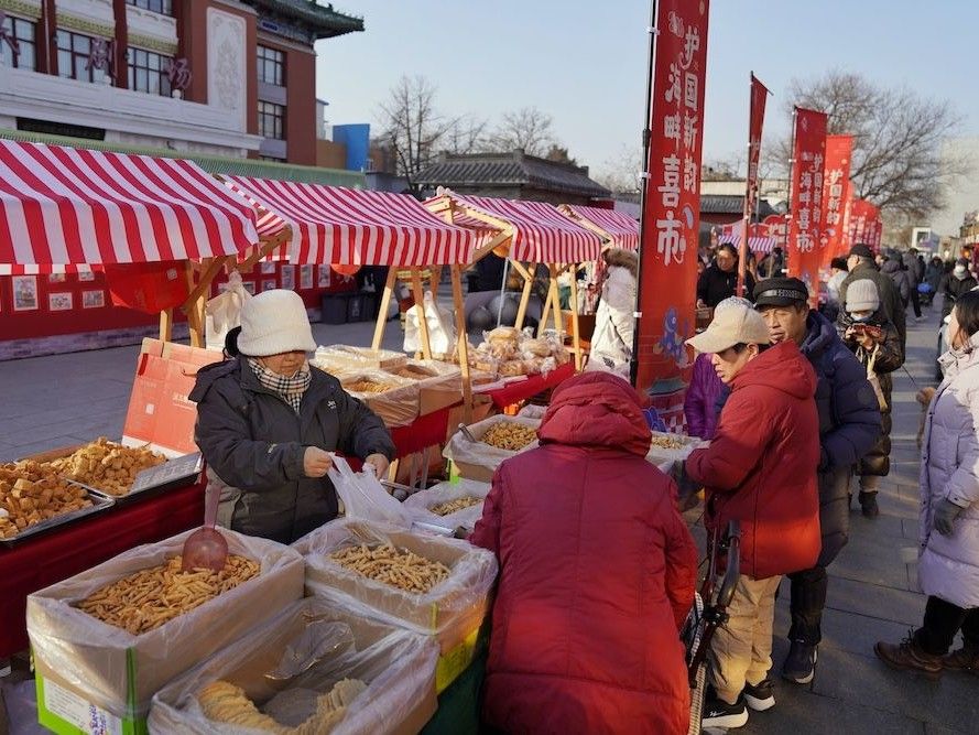 图为1月24日,北京,“护国新韵 海畔喜‘市’”护国寺市集正式开市,市民选购特色小吃。(北京《新京报》)
