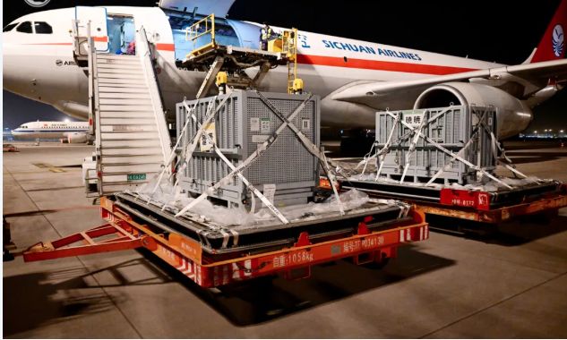 北京时间1月28日1时,中国旅居日本东京都恩赐上野动物园的大熊猫“晓晓”“蕾蕾”平安飞抵成都天府国际机场。(图/中国大熊猫保护研究中心微信公众号)