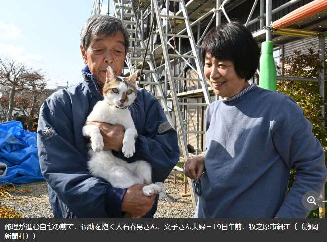 图为大石春男(左)和妻子在老宅前抱着爱猫福助。(图/《静冈新闻》报道截图)