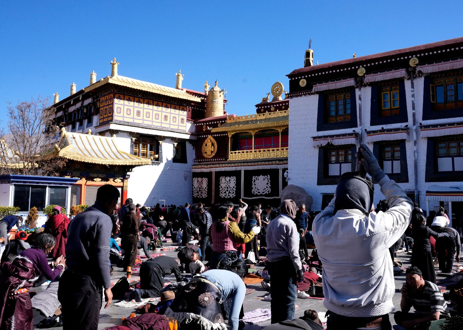 1月23日,西藏拉萨大昭寺外,信众磕长头。冬季高原进入农闲期,众多藏传佛教信众从各地来到拉萨,沿布达拉宫、大昭寺等地转经、朝拜、祈福。(图/中新社)
