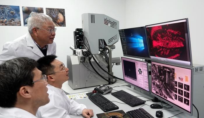 中国科学院南京古生物所朱茂炎院士、曾晗副研究员、赵方臣研究员(由远及近)在实验室研讨交流。(图/中新网)