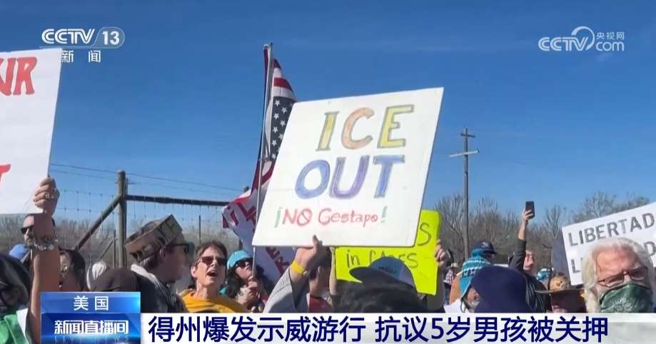 美国得克萨斯州迪利镇28日爆发示威游行活动,示威人群强烈抗议该镇的移民拘留设施关押了一名5岁男孩利亚姆。(图/中国央视新闻视频截图)