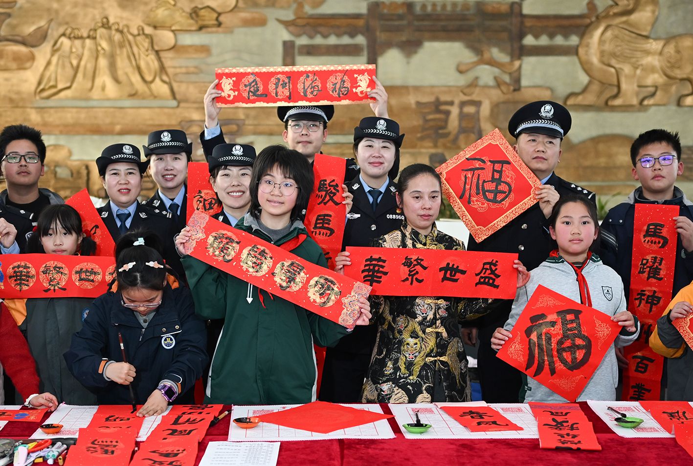 1月29日,春运将至,南京铁路公安处南京站派出所联合南京东站派出所,在南京火车站候车大厅开展“翰墨送福”主题活动,通过写书法送“福”字、春联,传递传统文化温度,营造平安、温馨的春运氛围。图为民警与参加活动的小书法家们展示主题书法作品。(中新社)