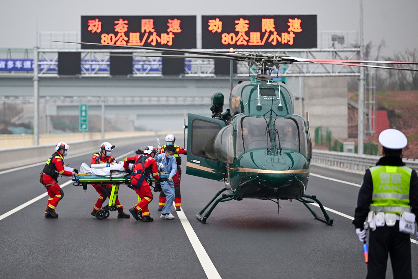 1月29日,2026年春运临近之际,四川省多部门联合在G42沪蓉高速成南段,开展全要素、全实战的应急救援综合演练。图为消防救援人员将一名重伤者送上直升机转送医院救治。(中新社)