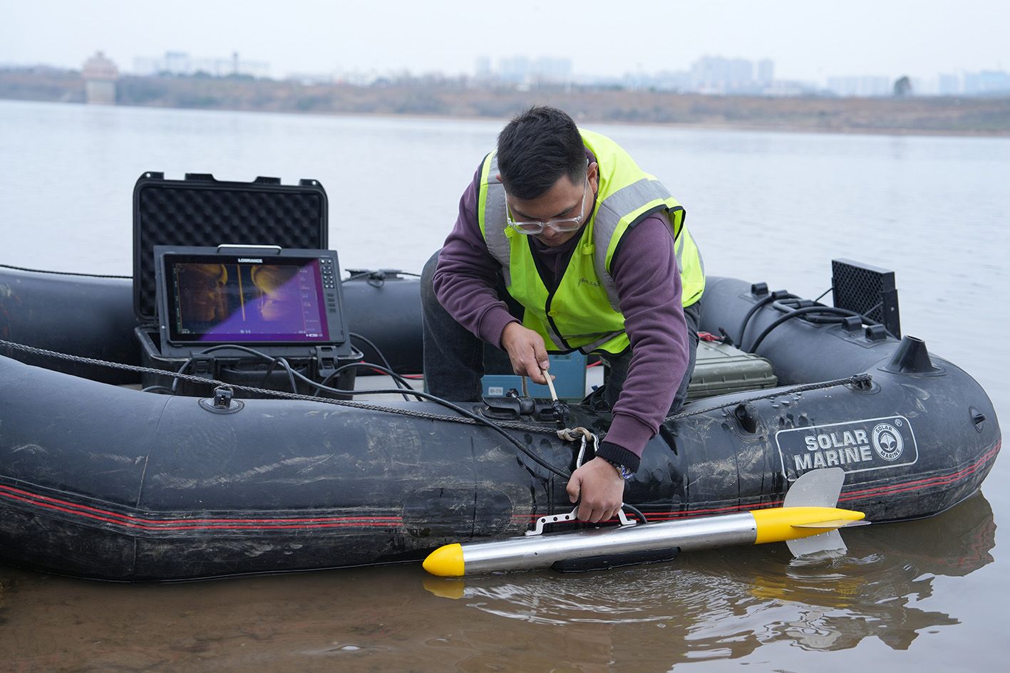 1月29日,春运将至,长沙高铁工务段作业人员使用水下巡查机器人、无人测量船、无人机等设备对位于湖南长沙的沪昆高铁湘江特大桥开展巡查检测。图为作业人员使用声呐设备检测桥墩。(中新社)