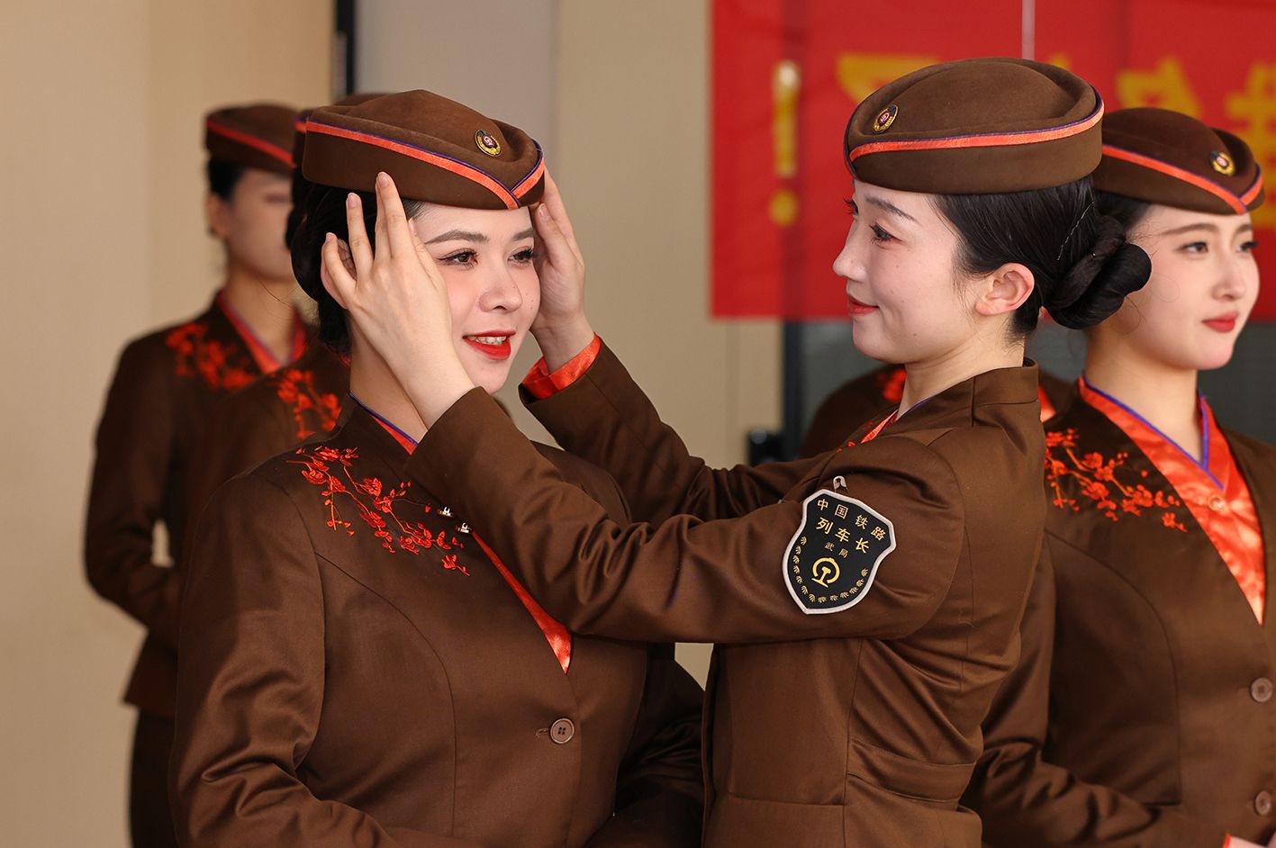1月28日,湖北武汉,乘务员在进行形体礼仪培训。当日,铁路武汉客运段汉口乘务中心乘务员等在武汉客运段汉口乘务中心进行形体礼仪、应急演练等方面的培训,为即将到来的春运做好准备。(中新社)