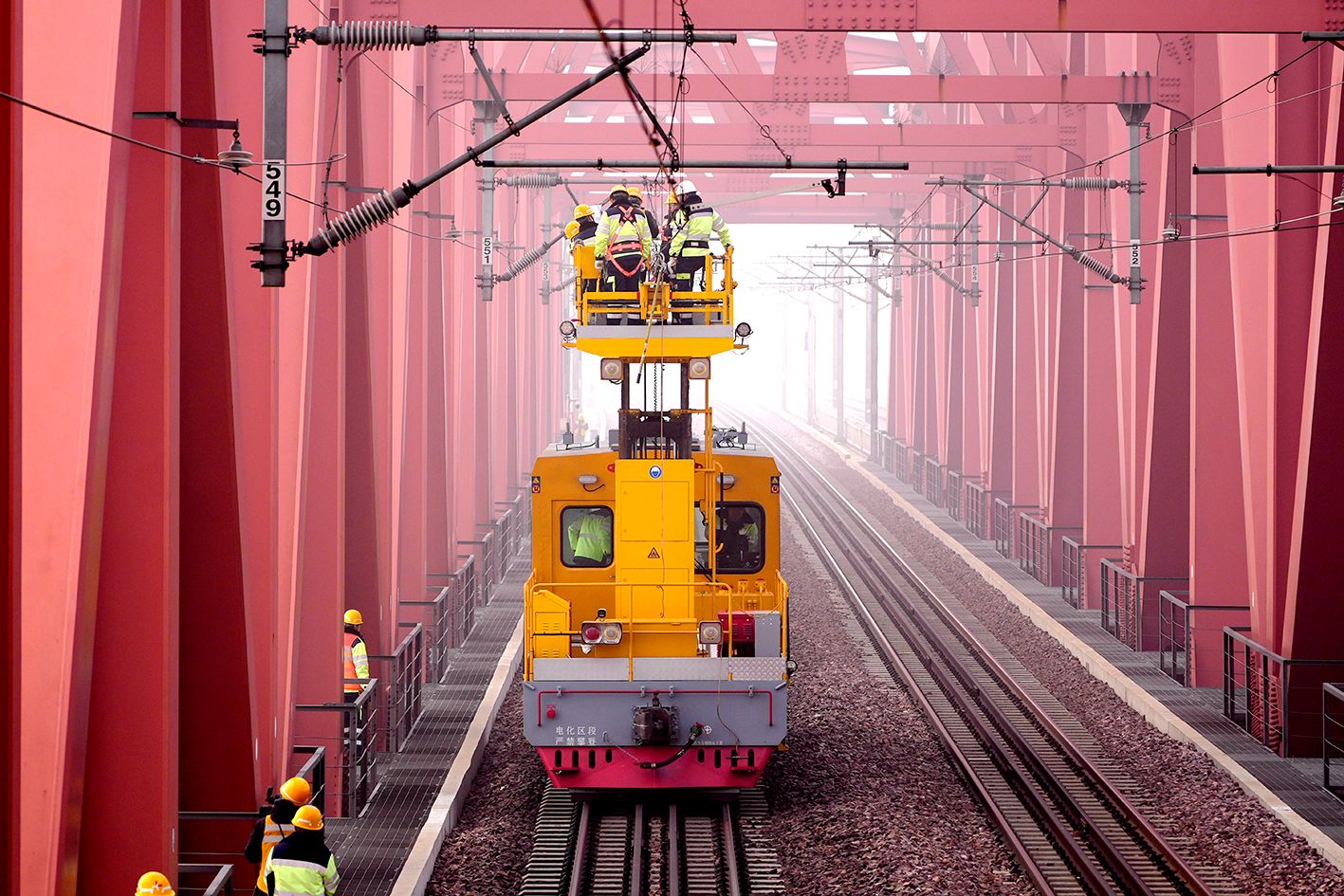 2026年春运大幕即将开启,为保障京广铁路黄河大桥供电安全,当地时间1月27日清晨,中国铁路郑州局集团有限公司郑州供电段25名作业人员冒着严寒,登上距离河面30余米高的大桥接触网检修平台进行全面检修作业。图为铁路“蜘蛛人”在大桥上的作业车上进行设备巡检。(中新社)