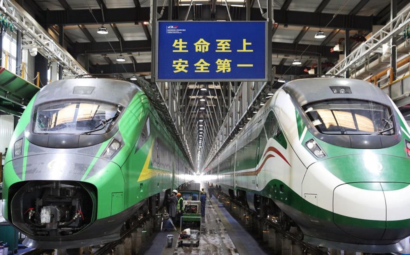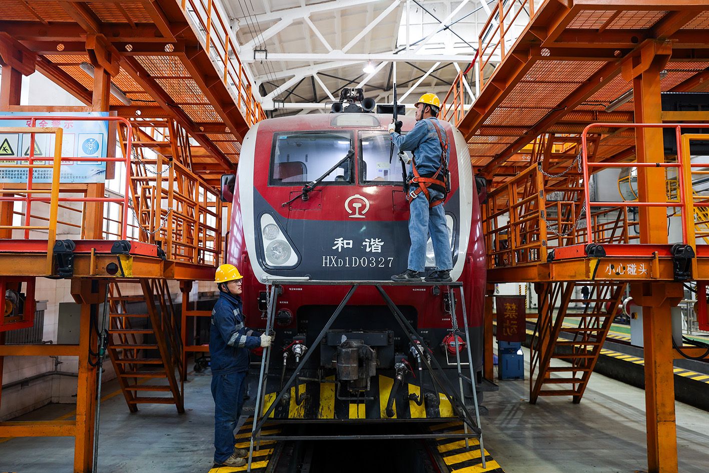近日,中国铁路青藏集团有限公司西宁机务段组织全员对80余台电力机车进行多维度检修提质,确保春运列车平稳安全运行。图为作业人员检查机车雨刮器装置并维护。(中新社)