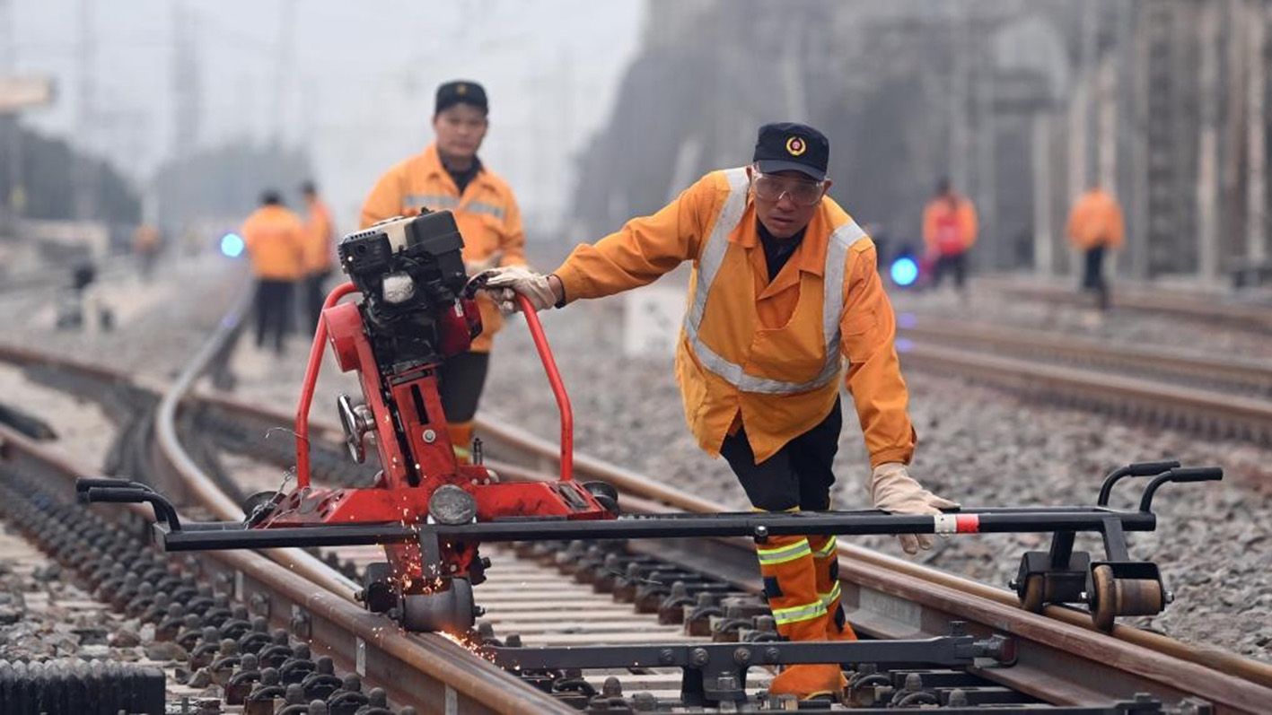 1月29日,中国铁路南宁局集团有限公司百色工务段八渡线路车间工人在进行钢轨打磨作业。(新华社)