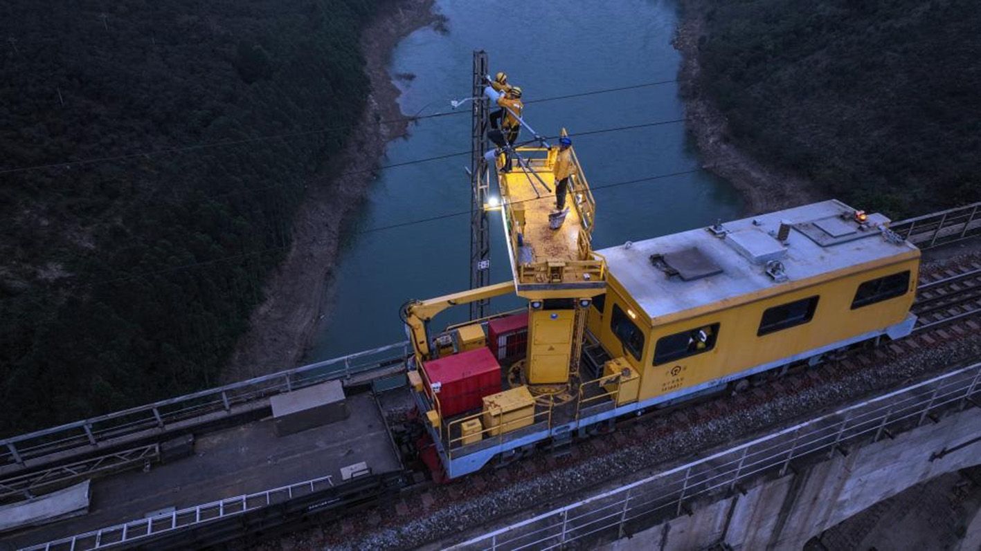 1月29日,中国铁路南宁局集团有限公司南宁供电段的接触网工在检修桥梁支柱上的接触网设备(无人机照片)。(新华社)