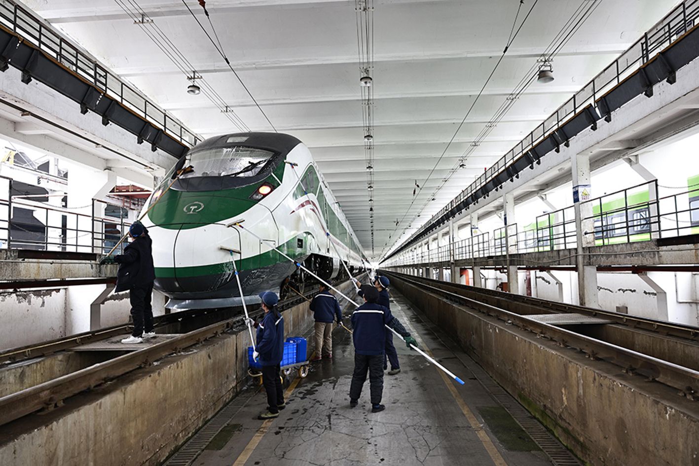 1月27日晚,工作人员在南京南动车运用所检修动车组列车。(新华社)