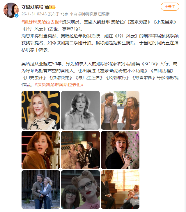太突然!著名女演员凯瑟琳·奥哈拉在家中去世!声望颇高,代表作耳熟能详……众多明星名人悼念