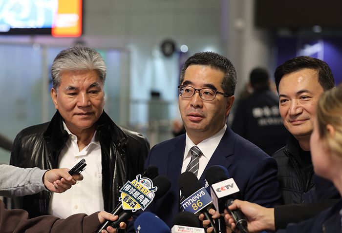 2月2日,萧旭岑率团启程前往大陆,参加即将在北京举行的“国共两党智库论坛”。图为萧旭岑(中)出发前在桃园机场接受采访。(图/中新社)