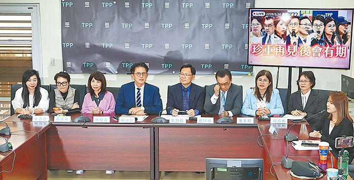 民众党立委林忆君(左起)、黄珊珊、陈昭姿、黄国昌、张启楷、林国成、麦玉珍、刘书彬1月30日举行“珍重再见后会有期!”记者会,感谢各界的支持。 (图台北中时新闻网)