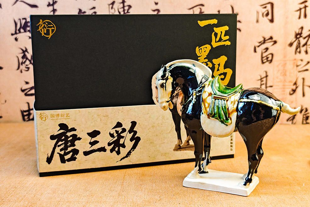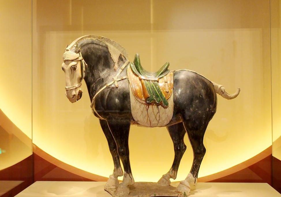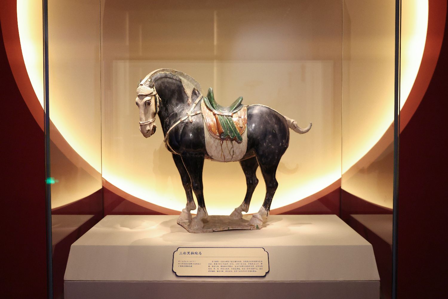 1月31日,北京,中国国家博物馆,“跃马扬鞭——马年新春文化展”上展出的“三彩黑釉陶马(唐)”。(中国央视网)