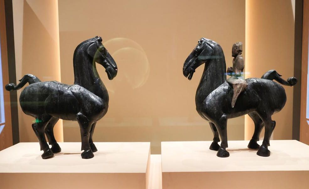 1月31日,北京,中国国家博物馆,“跃马扬鞭——马年新春文化展”上展出的西汉(公元前202-公元8年)时期的木胎漆马(左)和骑马木俑。(中国央视网)