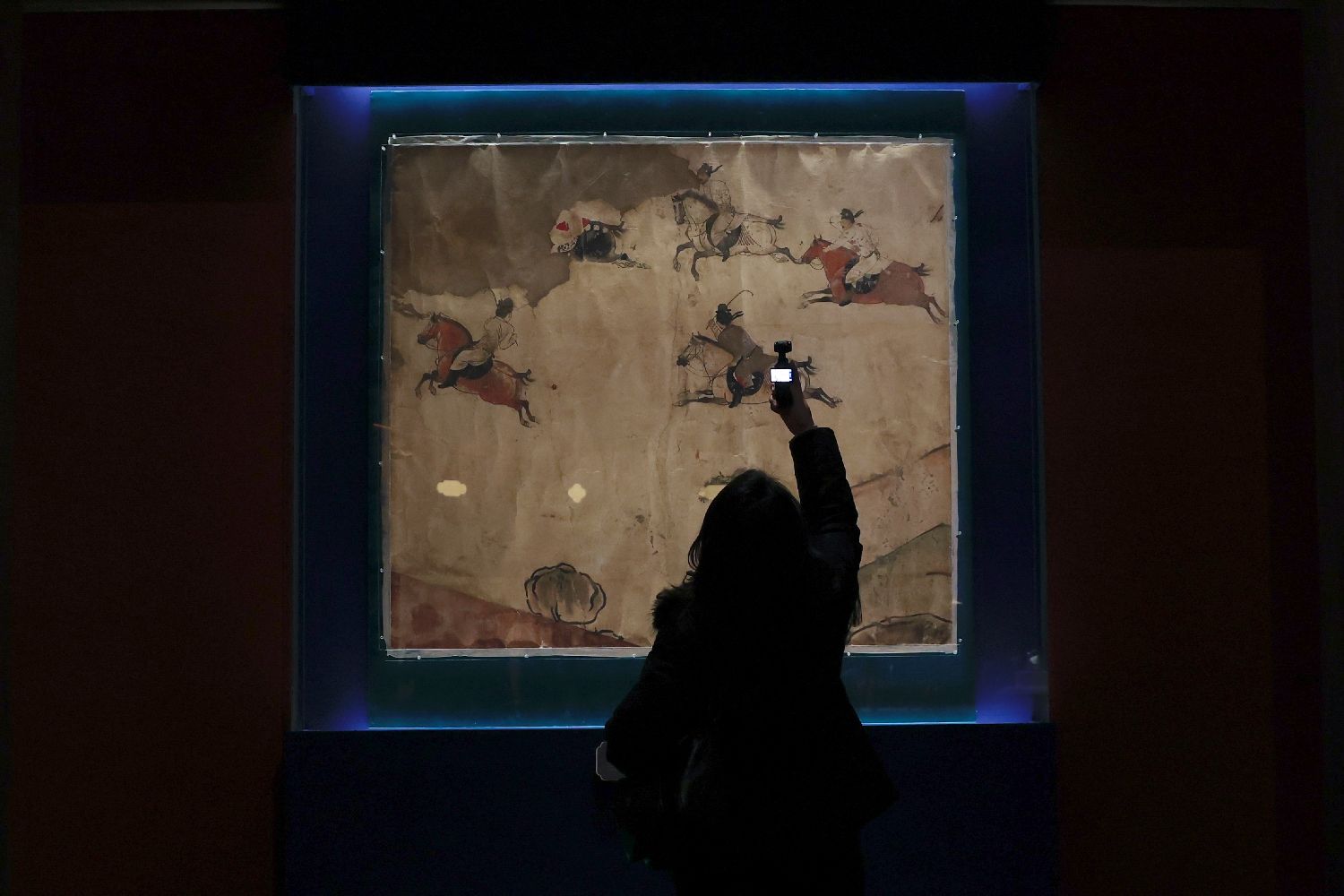 图为参观者拍摄打马球图(壁画临摹图)。(中新社)
