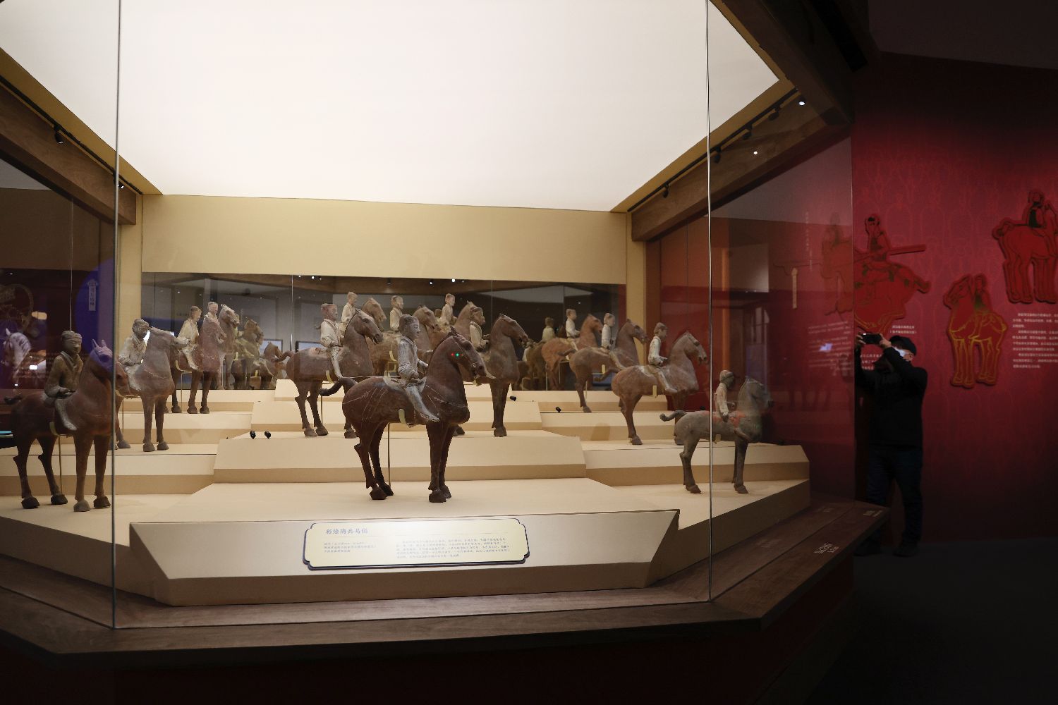 1月31日,北京,中国国家博物馆,“跃马扬鞭——马年新春文化展”上展出的彩绘陶兵马俑(西汉)。(中国央视网)