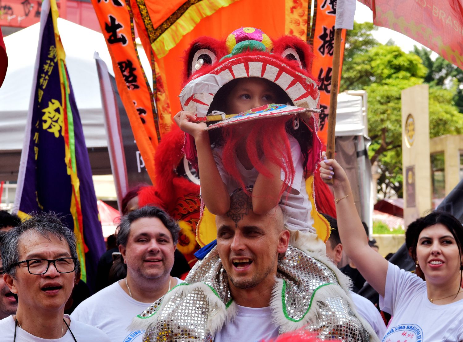 1月31日,巴西圣保罗,巴西中国友好协会偕圣保罗多家主要侨团、华校在华人聚集区圣保罗自由区广场举办“欢乐春节”游园会,书法、中医等中国元素吸引市民游客共庆农历马年春节。图为巴西多所功夫学校、龙狮团共襄盛举,一位小醒狮队员坐在团长肩上“督阵”。(中新社)