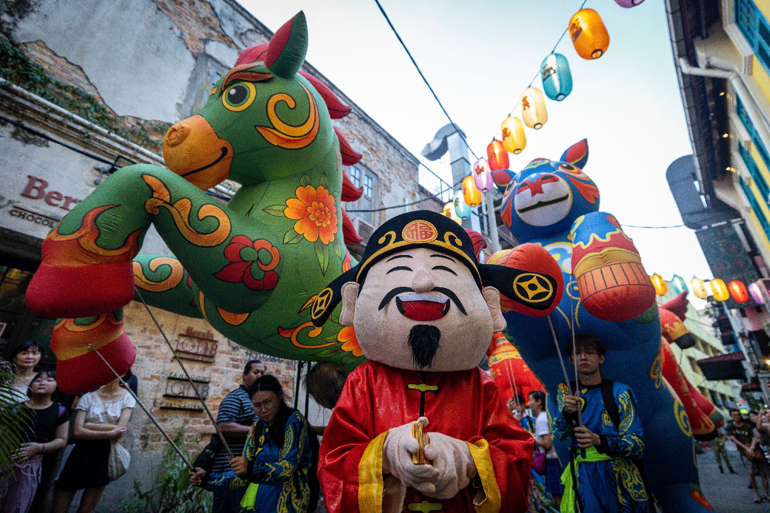 1月31日,马来西亚吉隆坡,马来西亚最高建筑默迪卡118大楼前,表演者们在迎接春节游行中抬着充气马偶灯笼。(CFP)