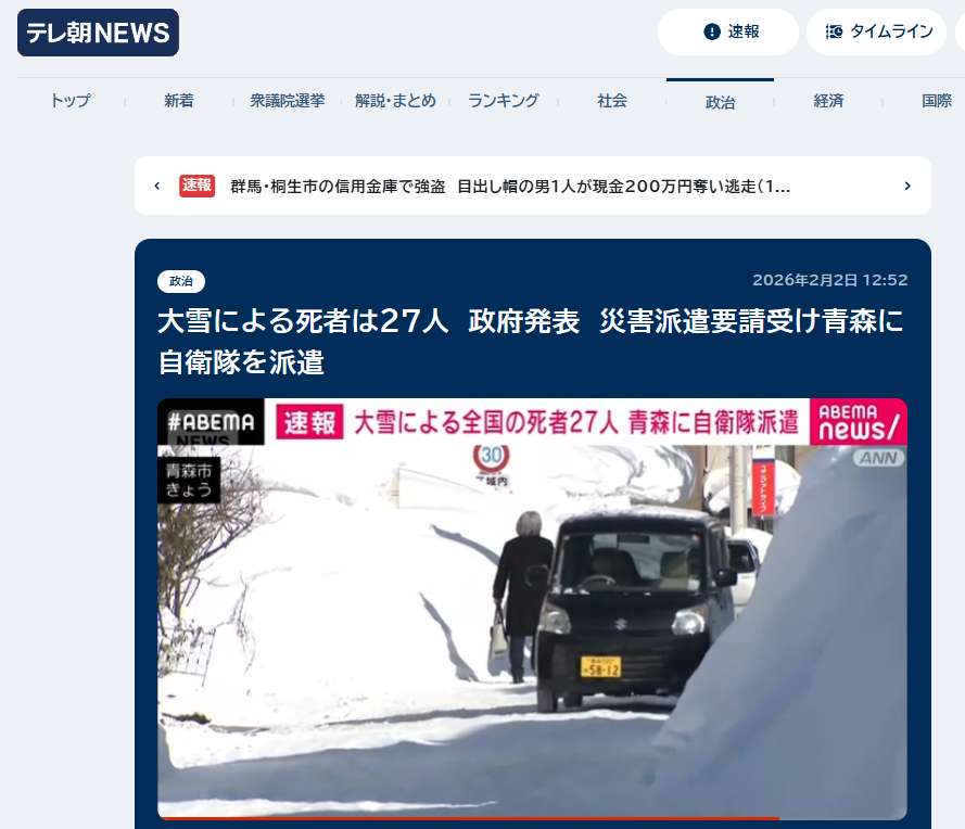 日本大雪已造成27人死亡。(图/朝日电视台报道截图)