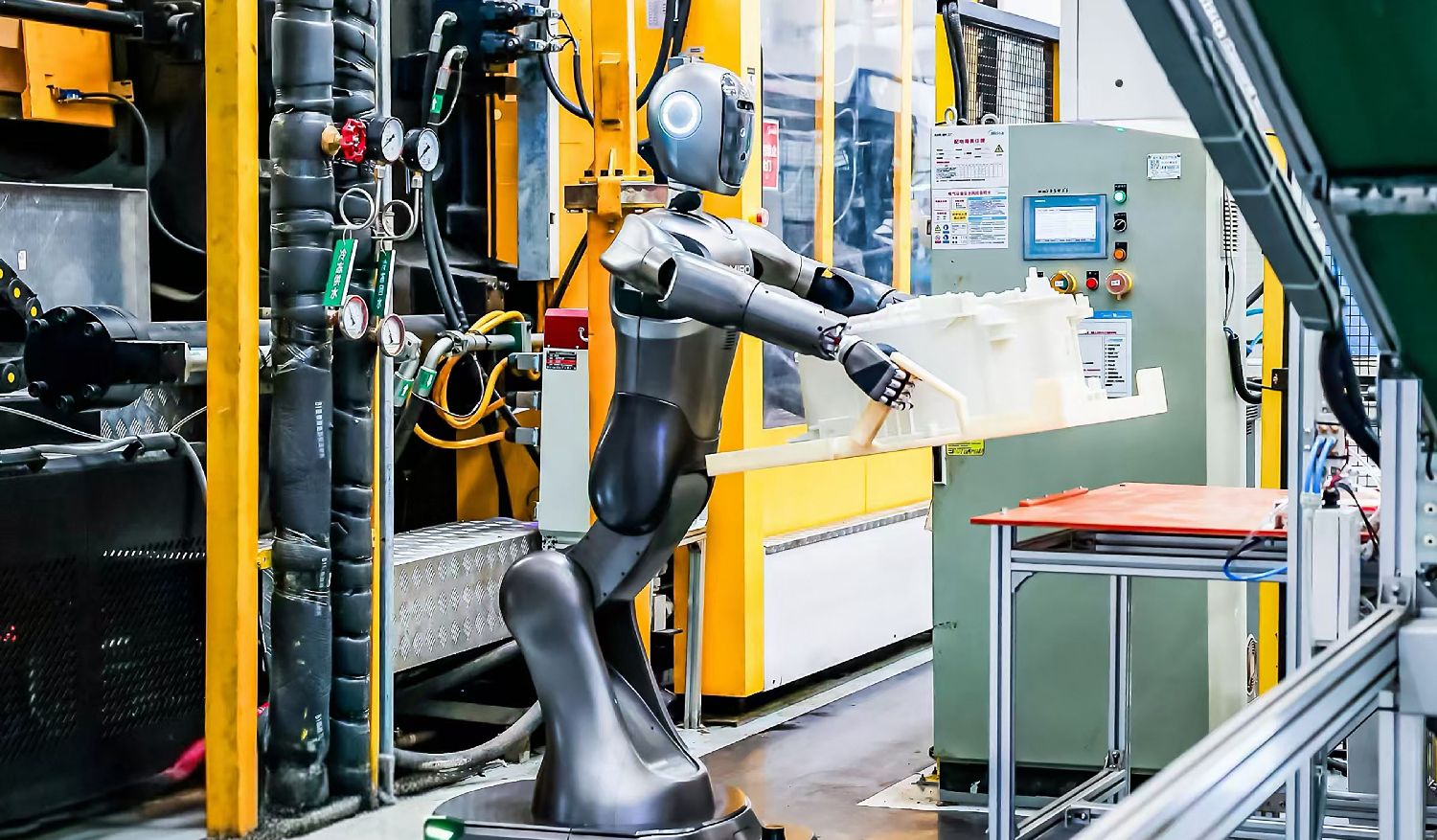 在美的洗衣机荆州工厂注塑车间,六臂轮足式人形机器人“美罗”,熟练地进行润滑操作、钣金上料等任务;其“同事”“玉兔”AI巡检机器人则在成排洗衣机间自如穿梭,精准检测……
