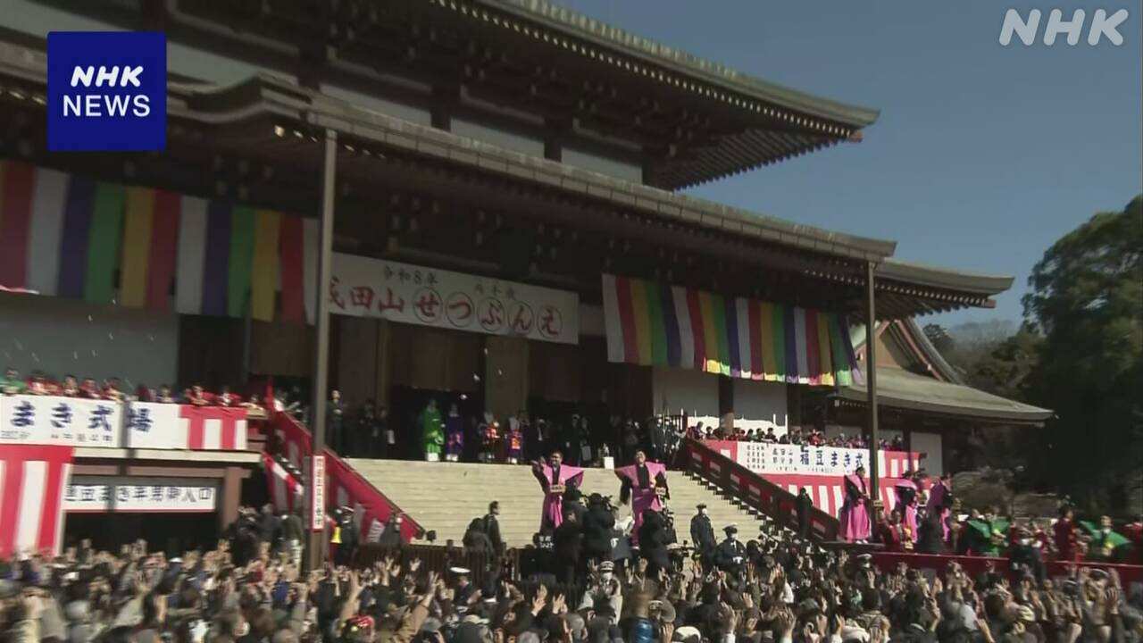 成田山新胜寺的撒豆仪式据称始于江户时代,旨在祈愿五谷丰登,每年都会有众多知名人士参与。今年,出演大河剧《丰臣兄弟!》、饰演主人公丰臣秀长的仲野太贺,以及饰演其青梅竹马直的白石圣,还有来自大相扑的横纲大之里和丰昇龙等人参加,从大本堂前的舞台上一齐撒豆。成田山新胜寺的撒豆活动有其独特之处:由于相传在本尊不动明王面前,连鬼也会悔改,因此不会喊“鬼出去”,而是反复高喊“福进来”。随着豆子被撒出,聚集在寺院内的大批民众纷纷伸出双手,希望抓住一年的幸福。