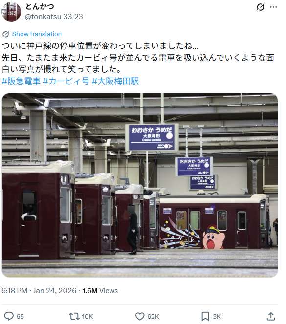 一张阪急神户线运行的任天堂旗下人气角色“星之卡比”主题列车的照片近日在社交平台X引发热议。众多日本网民表示,这张照片捕捉到了堪称奇迹的瞬间。截至发稿时,相关帖文浏览量突破150万次,获赞超6万次。