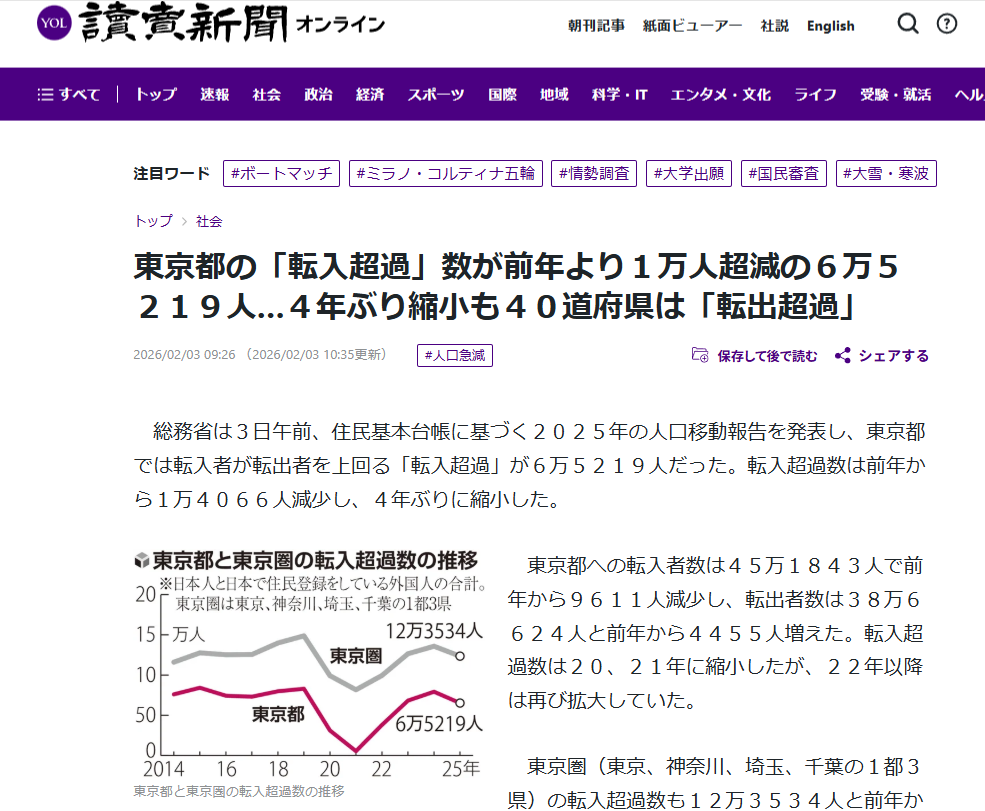 东京都2025年净流入人口为65219人。(图/《读卖新闻》报道截图)
