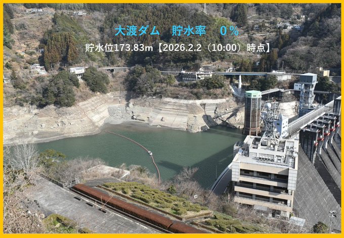 据报道,国土交通省大渡水库管理局2月2日在社交媒体上发文称,大渡水库遭遇大坝建成以来前所未有干涸,蓄水率于1月31日降至0%。管理局还发出2025年11月11日和2026年2月2日的对比图片,可以看到水位明显下降,部分河床露出水面。